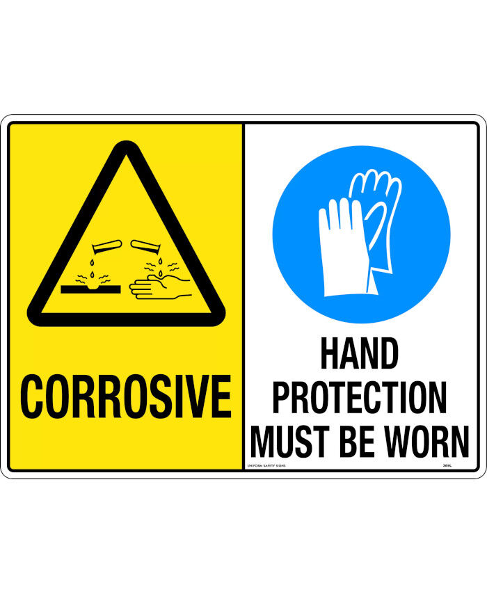 WORKWEAR, SAFETY & CORPORATE CLOTHING SPECIALISTS - 240x180mm - Self Adhesive - Multi Sign - Corrosive / Hand Protection Must Be Worn