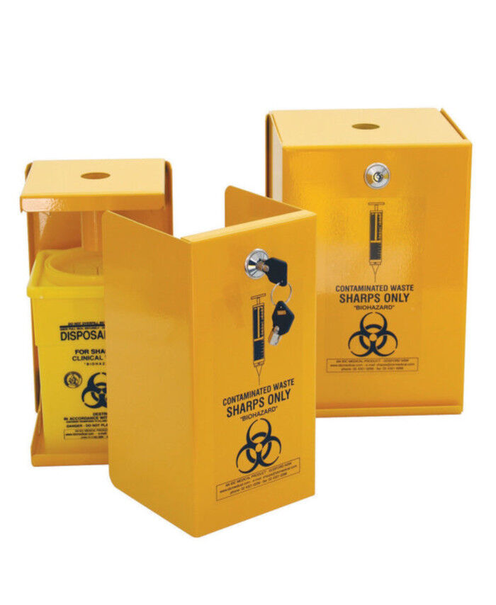 SHARPS METAL SAFE, 5L, YELLOW ARMOUR, INCLUDES 2 SQUARE 5L PLASTIC SHARPS CONTAINERS
